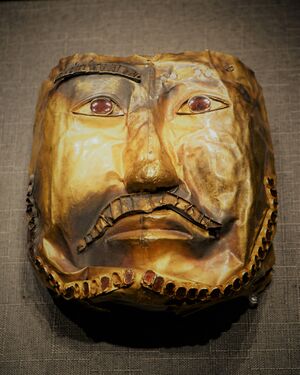 A golden mask inlaid with rubies, likely from the First Turkic Khaganate (552–603). It was excavated at the Boma tomb in Zhaosu County and is a part of the Ili Prefecture Museum's collection.[4] |