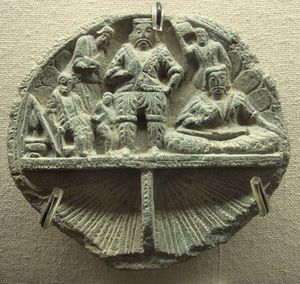 Individuals in Indo-Parthian attire are sometimes shown as actors in Buddhist devotional scenes. It is usually considered that most of the excavations that were done at Sirkap near Taxila by John Marshall relate to Indo-Parthian layers, although more recent scholarship sometimes relates them to the Indo-Greeks instead.[32] These archaeological researches provided a quantity of Hellenistic artifacts combined with elements of Buddhist worship (stupas). Some other temples, such as nearby Jandial may have been used as a Zoroastrian fire temple.