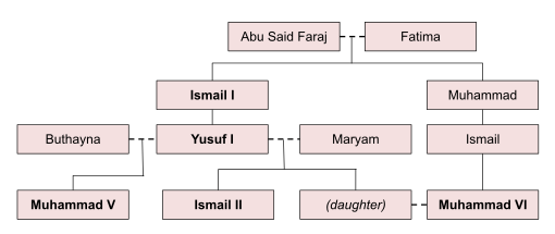 Abu al-Walid Ismail ibn Yusuf was born on 4 October 1339 (28 Rabi al-Awwal 740 AH).[8] His father was Sultan Yusuf I and his mother was the Sultan's concubine Maryam. He was the second son of his father, born nine months after Muhammad, the first son of another concubine, Buthayna. Ismail had at least three younger full siblings: his brother Qays and sisters Shams and Zaynab. Other than Muhammad, he had a half-sister Aisha, also a child of Buthayna. Maryam seems to have had more influence over the Sultan than Buthayna, and Ismail was also his favourite son.[9] Yusuf's hajib (chamberlain), Abu Nu'aym Ridwan, was responsible for the education of Ismail and the other princes.[9] Ismail learned some Greek from the Ridwan, who was a former Christian.[10] The Nasrid dynasty did not have a predetermined order of succession;[11] initially, Yusuf designated Ismail as his heir, but, a few days before his death, he named Muhammad instead.[8]