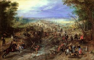 Like his father, Jan Brueghel also painted various village landscapes. He used the surrounding landscapes as the stage for the crowds of anecdotal, colourfully dressed peasants who engage in various activities in the market, the country roads and during the rowdy kermesses.[36] Jan Brueghel's landscape paintings with their strong narrative elements and attention to detail had a significant influence on Flemish and Dutch landscape artists in the second decade of the 17th century. His river views were certainly known to painters working in Haarlem, including Esaias van de Velde and Willem Buytewech, whom Brueghel may have met there when he accompanied Peter Paul Rubens on a diplomatic mission to the Dutch Republic in 1613.[38]