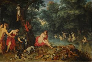 His collaborations with figure painter Hans Rottenhammer began in Rome around 1595 and ended in 1610. Rottenhammer was a gifted figure painter and known for his skill in painting nudes. Initially when the artists both lived in Venice, their collaborative works were executed on canvas, but in their later collaborations after Brueghel had returned to Antwerp they typically used copper. After Brueghel's return to Antwerp, their collaboration practice was for Brueghel to send the coppers with the landscape to Rottenhammer in Venice, who painted in the figures and then returned the coppers. In a few instances, the process was the other way around.[21] Brueghel and Rottenhammer did not collaborate only on landscape paintings with figures; they jointly created one of the earliest devotional garland paintings, made for Cardinal Federico Borromeo, depicting a Virgin and Child surrounded by a flower garland (Pinacoteca Ambrosiana).[22]