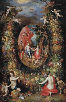 An example of a collaborative garland painting he made with Hendrick van Balen is the Garland of Fruit surrounding a Depiction of a Goddess Receiving Gifts from Personifications of the Four Seasons of which there are two versions, one in the Belfius collection and a second in the Mauritshuis in The Hague.[33] Both versions are considered to be autograph paintings, but small differences between the two suggest that the panel in the Belfius collection is the original version.[18] The medallion in the centre is traditionally believed to depict Cybele, the ancient Phrygian goddess of the earth and nature as it was described as such in 1774 when it was catalogued in the collection of William V, Prince of Orange in The Hague.[34] More recently an identification of the goddess with Ceres, the Roman goddess of agriculture, grain crops, fertility and motherly relationships, has been proposed. The reason is that the goddess in the medallion has none of the attributes traditionally connected with Cybele.[18] Around the medallion is suspended a garland of flowers, vegetables and fruit – a tribute to the goddess and an ode to plenty and fertility. Van Balen painted the medallion while Brueghel painted the abundant garland, the surrounding figures and the numerous animals.[35]