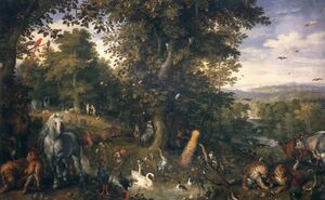 Jan Brueghel invented the 'paradise landscape', a subgenre that involved a combination of landscape and animal painting. Works in this genre are typically crawling with numerous animals from exotic and native European species who coexist harmoniously in a lush landscape setting. These landscapes are inspired by episodes from Genesis, the chapter of the bible, which tells the story of the creation of the world and of man. The favourite themes taken from Genesis where the creation of man, Adam and Eve in paradise, the fall of man and the entry of the animals in Noah's ark.