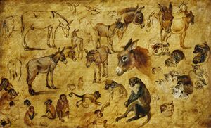 Breughel contributed to the development of the genre of the 'monkey scene', also called 'singerie' (a word derived from the French for 'monkey' and meaning a 'comical grimace, behaviour or trick').[49] Comical scenes with monkeys appearing in human attire and a human environment are a pictorial genre that was initiated in Flemish painting in the 16th century and was further developed in the 17th century.[50] Monkeys were regarded as shameless and impish creatures and excellent imitators of human behaviour. These depictions of monkeys enacting various human roles were a playful metaphor for all the folly in the world.[51]