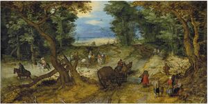 Jan Brueghel was along with artists such as Gillis van Coninxloo one of the prime developers of the dense forest landscape in the 17th century. Jan Breughel experimented with such works before Coninxloo's first dated wooded landscape of 1598. In his forest landscapes Brueghel depicted heavily wooded glades in which he captured the verdant density, and even mystery, of the forest. Although on occasion inhabited by humans and animals, these forest scenes contain dark recesses, virtually no open sky and no outlet for the eye to penetrate beyond the thick trees.[39]
