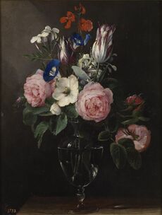 This arrangement is clear in the Flowers in a Ceramic Vase (c. 1620, Royal Museum of Fine Arts Antwerp). The vase in which the flowers are arranged is decorated with motifs in relief. The two cartouches - separated by a fantastic figure - show Amphitrite, a sea goddess from Greek mythology, on the left, and Ceres, the Roman corn goddess, on the right. These two goddesses were typically used in allegorical representations of the four elements to symbolise water and earth respectively. The other two cartouches on that part of the vase that is invisible likely show Vulcan, who was associated with fire, and Apollo, who was associated with air.[28] The occurrence of the four elements and the flowers in a single work can be interpreted as the emanation of the macrocosm in the microcosm.[30]