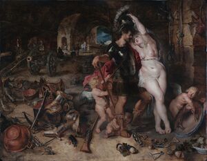 Brueghel appears to have been the principal initiator of their joint works, which were made principally during the second half of the 1610s when their method of collaboration had become more systemised and included Rubens' workshop. Usually it would be Brueghel who started a painting and he would leave space for Rubens to add the figures.[24] In their early collaborations they seem to have made major corrections to the work of the other. For instance, in the early collaborative effort The Return from War: Mars Disarmed by Venus Rubens overpainted most of the lower-right corner with grey paint so he could enlarge his figures. In later collaborations the artists seem to have streamlined their collaboration and agreed on the composition early on so that these later works show little underdrawing.[25] As court painters to the archdukes their collaborations reflected the court's desire to emphasise the continuity of its reign with the previous Burgundian and Habsburg rulers as well as the rulers' piousness. While they were mindful of the prevailing tastes in courtly circles, which favoured subjects such as the hunt, the two artists were creative in their response to the court's preferences by devising new iconography and genres, such as the devotional garland paintings, which were equally capable of conveying the devoutness and splendour of the archducal court. The joint artistic output of Brueghel and Rubens was highly prized by collectors all over Europe.[24]