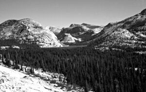 Finally settling in San Francisco, Muir immediately left for a week-long visit to Yosemite, a place he had only read about. Seeing it for the first time, Muir notes that "He was overwhelmed by the landscape, scrambling down steep cliff faces to get a closer look at the waterfalls, whooping and howling at the vistas, jumping tirelessly from flower to flower."[14] He later returned to Yosemite and worked as a shepherd for a season. He climbed a number of mountains, including Cathedral Peak and Mount Dana, and hiked an old trail down Bloody Canyon to Mono Lake.