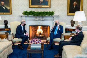 Støre led the party into the 2021 Norwegian parliamentary election, this time securing the red-green coalition a majority with 89 seats (85 being needed for a majority), defeating the blue-blue coalition led by incumbent prime minister Erna Solberg.[40] Pre-government negotiations began on 23 September in Hurdal, after the Centre Party became open to working with the Socialist Left Party. On 29 September, the Socialist Left Party withdrew from negotiations, notably citing disagreements on issues such as petroleum and welfare. Støre expressed disappointment and said he had hoped for a different outcome, but added he respected the party's decision.[41][42] The Labour Party and Centre Party began government negotiations later that same day.[43] On 8 October, Støre and Vedum announced that the new government's platform would be presented on 13 October and that they were ready to form a government the day after, on 14 October.[44] After Eva Kristin Hansen was nominated as the Labour Party's candidate for President of the Storting, Støre presented the proposal in the Storting on 9 October, and the vote to confirm her happened in writing. Hansen was confirmed with 160 votes in favour and 8 abstaining.[45]