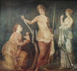A woman, perhaps Lucina, goddess of childbirth, presents the goddess of love, Aphrodite (Roman Venus) with the beautiful infant Adonis.