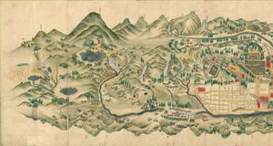 Meanwhile, Ieyasu himself establish his personal new seat of power on Edo town, which at that time was an underdeveloped town in Kantō.[43][أ]