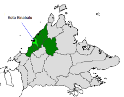 Location of Kota Kinabalu district and the city within the West Coast Division of Sabah.