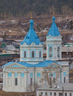 Kyakhta was crowded, unclean, ill-planned, and never came to reflect the wealth that flowed through it,[15] although several Neoclassical buildings were erected in the 19th century, including a tea bourse (1842) and the Orthodox cathedral (1807–1817), both of which still stand. In 1996 the Voskreskenskaya church was being used as a stable.[16] It was from Kyakhta that Nikolay Przhevalsky, Grigory Potanin, Pyotr Kozlov, and Vladimir Obruchev set off on their expeditions into the interior of Mongolia and Xinjiang.