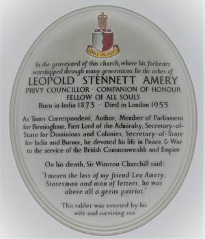Amery is buried in the churchyard of St John the Baptist in his father's home village of Lustleigh, and an ornate plaque in commemoration of him is inside the church.