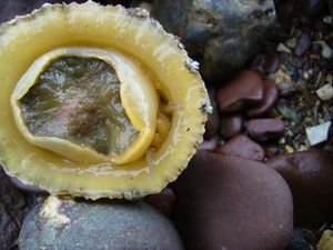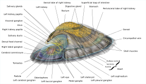 | البطلينوس على سطح صخري، اليسرى مقلوبة ومنزوع صدفتها، حيث تظهر الأعضاء المحمية بواسطة الصدفة، بما فيها القدم والشفاطة | |