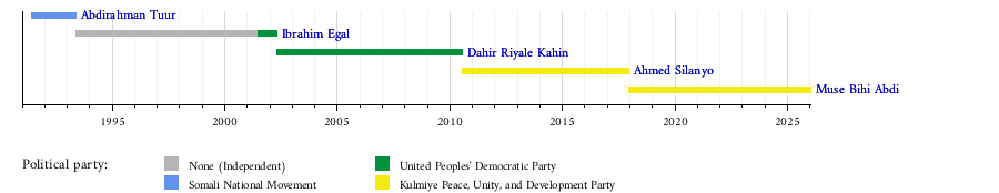 2017 | 13 December 2017 | Incumbent | 8 years, 24 days | Peace, Unity, and Development Party (KULMIYE) | |