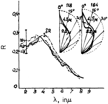 {{cite journal}}: Cite has empty unknown parameter:|تنسيق=(help); Cite journal requires|journal=(help); Unknown parameter|اقتباس=ignored (help); Unknown parameter|العدد=ignored (help); Unknown parameter|المجلد=ignored (help); Unknown parameter|تاريخ أرشيف=ignored (help); Unknown parameter|تاريخ الوصول=ignored (help); Unknown parameter|صحيفة=ignored (help); Unknown parameter|مسار أرشيف=ignored (help) - ^ Markov, M.N.; Petrov, V.S.; Akhmanova, M.V.; Dement'ev, B.V. (1980). Rycroft, M.J. (ed.). "Infrared reflection spectra of the moon and lunar soil". COSPAR Colloquia Series. Bangalore, India (published 1 January 1980). pp. 189–192. doi:10.1016/S0964-2749(13)60040-2. ISBN 978-0-08-024437-2.