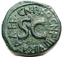 نقش "" على وجه عملة الآس As، من إصدار الإمبراطور أغسطس.