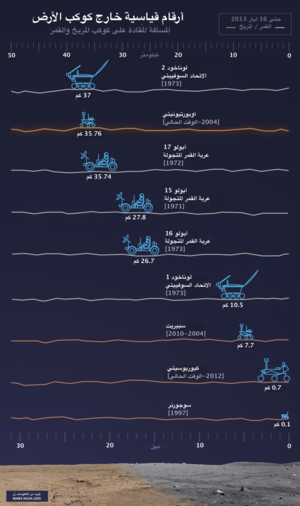 مقارنة بين المسافات التي قادتها العربات المتجولة على سطحي المريخ والقمر حسب ناسا حتى تاريخ 16 أيار 2013