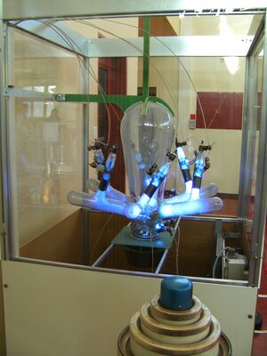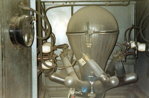Mercury rectifier on display in the Beromünster AM transmitter in Switzerland, before being decommissioned. Three-phase full-wave rectifier with six anodes.