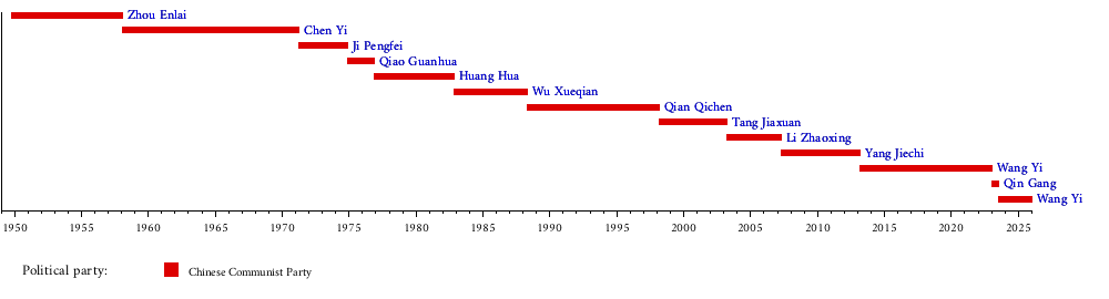 Wang Yi (politician)Qin GangWang Yi (politician)Yang JiechiLi ZhaoxingTang JiaxuanQian QichenWu XueqianHuang HuaQiao GuanhuaJi PengfeiChen Yi (marshal)Zhou Enlai