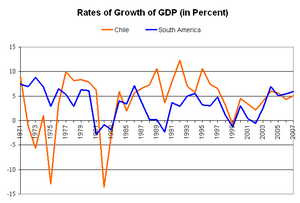يذكر الحائز على جائزة نوبل والخبير الاقتصادي گاري بيكر أن "النمو السنوي لنصيب الفرد من الدخل الحقيقي في تشيلى من عام 1985 إلى عام 1996 قد بلغ في المتوسط 5 في المائة، وهو أعلى بكثير من بقية دول أمريكا اللاتينية."[21] ومنذ ذلك الحين، بلغ متوسط النمو السنوي للاقتصاد 3٪ في الناتج المحلي الإجمالي.[22]