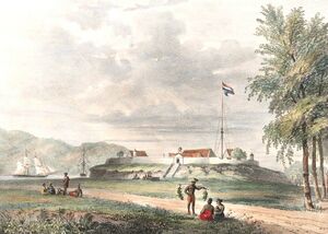 The Dutch arrived in 1599 and competed with the Portuguese in the area for trade.[19] The Dutch East India Company in the course of Dutch–Portuguese War allied with the Sultan of Ternate and conquered Ambon and Tidore in 1605, expelling the Portuguese. A Spanish counterattack from the Philippines restored Iberian rule in parts of North Maluku up to 1663. However, the Dutch monopolized the production and trade of spices through a ruthless policy. This included the genocidal conquest of the nutmeg-producing Banda Islands in 1621, the elimination of the English in Ambon in 1623, and the subordination of Ternate and Tidore in the 1650s. An anticolonial resistance movement led by a Tidore prince, the Nuku Rebellion, engulfed large parts of Maluku and Papua in 1780-1810 and co-opted the British. During the French Revolutionary Wars and again in the Napoleonic Wars, British forces captured the islands in 1796–1801 and 1810, respectively, and held them until 1817. In that time they uprooted many of the spice trees for transplantation throughout the British Empire.[20]