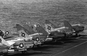 Vought A-7E Corsair II aircraft of attack squadrons VFA-15 Valions and VFA-87 Golden Warriors of Carrier Air Wing Six (CVW-6) line the flight deck of the aircraft carrier يوإس‌إس Independence (CV-62) in December 1983