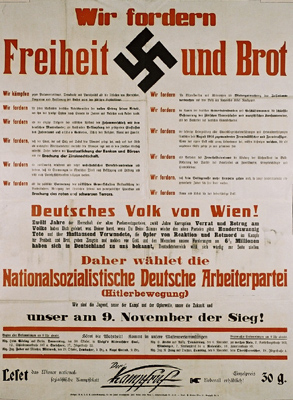 NSDAP election poster in Vienna in 1930. Translation: "We demand freedom and bread".