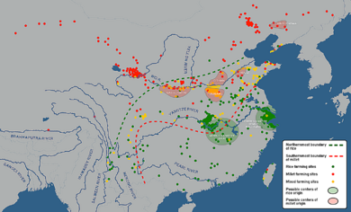 - ^ أ ب ت ث ج ح He, Keyang; Lu, Houyuan; Zhang, Jianping; Wang, Can; Huan, Xiujia (7 June 2017). "Prehistoric evolution of the dualistic structure mixed rice and millet farming in China". The Holocene. 27 (12): 1885–1898. Bibcode:2017Holoc..27.1885H. doi:10.1177/0959683617708455. S2CID 133660098.