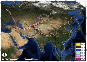 Material was copied from this source, which is available under a Creative Commons Attribution 4.0 International License Jones, Martin K.; Kovaleva, Olga (18 July 2018). "Barley heads east: Genetic analyses reveal routes of spread through diverse Eurasian landscapes". PLOS ONE (in الإنجليزية). 13 (7): e0196652. Bibcode:2018PLoSO..1396652L. doi:10.1371/journal.pone.0196652. ISSN 1932-6203. PMC 6051582. PMID 30020920.