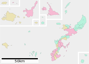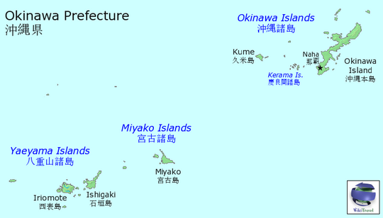 Okinawa Prefecture (يابانية: 沖縄県/おきなわけん, Hepburn: Okinawa Ken, Okinawan: 沖縄県, romanized: Uchināchin[2]) is the southernmost and westernmost prefecture of Japan.[3] It consists of three main island groups—the Okinawa Islands, the Sakishima Islands, and the Daitō Islands—spread across a maritime zone approximately 1,000 kilometers east to west and 400 kilometers north to south. Despite a modest land area of 2,281 km² (880 sq mi), Okinawa’s territorial extent over surrounding seas makes its total area nearly half the combined size of Honshu, Shikoku, and Kyushu.[4] Of its 160 islands, 49 are inhabited.[5] The largest and most populous island is Okinawa Island, which hosts the capital city, Naha, as well as major urban centers such as Okinawa, Uruma, and Urasoe.[6] The prefecture has a subtropical climate, characterized by warm temperatures and high rainfall throughout the year.[7] The indigenous inhabitants are the Ryukyuans, who also reside in the nearby Amami Islands of Kagoshima Prefecture.