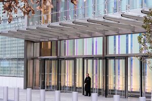 Originally, the base was to be covered in decorative prismatic glass, but a simpler glass-and-steel façade was adopted when the prisms proved unworkable.[51] The current base cladding consists of angled glass fins protruding from stainless steel panels, similar to those on 7 World Trade Center. LED lights behind the panels illuminate the base at night.[131] There are cable-net glass facade panels on all elevations of the building, designed by Schlaich Bergermann, will be consistent with the other buildings in the complex. The facade panels are 60 أقدام (18 m) high, and range in width from 30 أقدام (9.1 m) on the east and west sides, 50 أقدام (15 m) on the north side, and 70 أقدام (21 m) on the south side.[7] The curtain wall was manufactured and assembled by Benson Industries in Portland, Oregon, using glass made in Minnesota by Viracon.[132]