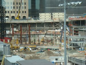 The symbolic cornerstone of One World Trade Center was laid in a ceremony on July 4, 2004.[54] The stone had an inscription supposedly written by Arthur J. Finkelstein.[55] Construction was delayed until 2006 due to disputes over money, security, and design.[54] The last major issues were resolved on April 26, 2006, when a deal was made between developer Larry Silverstein and the Port Authority of New York and New Jersey, so the cornerstone was temporarily removed from the site on June 23, 2006.[56] Soon after, explosives were detonated at the construction site for two months to clear bedrock for the building's foundation, onto which 400 ياردة مكعبة (310 متر مكعب) of concrete was poured by November 2007.[57] In a December 18, 2006, ceremony held in nearby Battery Park City, members of the public were invited to sign the first 30-قدم (9.1 m) steel beam installed onto the building's base.[58][59] It was welded onto the building's base on December 19, 2006.[60] Foundation and steel installation began shortly afterward, so the tower's footings and foundation were nearly complete within a year.[61] An estimate in February 2007 placed the initial construction cost of One World Trade Center at about $3 billion, or $1,150 per square foot ($12,380 per square meter).[62]