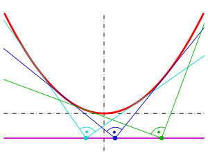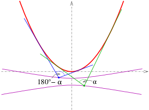 Isoptics (purple) of a parabola for angles 80° and 100°