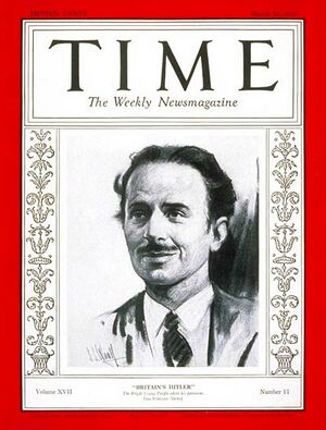 Sir Oswald Ernald Mosley, 6th Baronet (16 November 1896 – 3 December 1980), was a British politician who rose to fame during the 1920s and 1930s when, having become disillusioned with mainstream politics, he turned to fascism. Mosley was the son of a baronet. He was a member of parliament and later founded and led the British Union of Fascists (BUF).[1][2][3]
