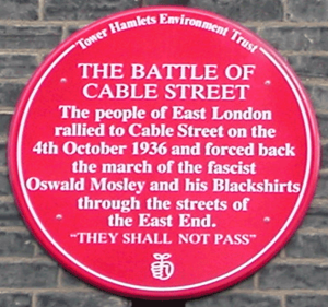 In October 1936, Mosley and the BUF tried to march through an area with a high proportion of Jewish residents. Violence, now called the Battle of Cable Street, resulted between protesters trying to block the march and police trying to force it through. Sir Philip Game, the police commissioner, stopped the march from proceeding and the BUF abandoned it.