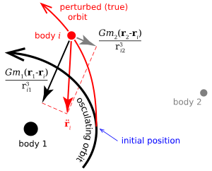 where خطأ رياضيات (اعرض بصيغة MathML إن أمكن (تحت التجريب): رد غير صحيح ("Math extension cannot connect to Restbase.") من الخادم "https://wikimedia.org/api/rest_v1/":): {\displaystyle \mu = G(M+m)} is the gravitational parameter with خطأ رياضيات (اعرض بصيغة MathML إن أمكن (تحت التجريب): رد غير صحيح ("Math extension cannot connect to Restbase.") من الخادم "https://wikimedia.org/api/rest_v1/":): {\displaystyle M} and خطأ رياضيات (اعرض بصيغة MathML إن أمكن (تحت التجريب): رد غير صحيح ("Math extension cannot connect to Restbase.") من الخادم "https://wikimedia.org/api/rest_v1/":): {\displaystyle m} the masses of the central body and the perturbed body, خطأ رياضيات (اعرض بصيغة MathML إن أمكن (تحت التجريب): رد غير صحيح ("Math extension cannot connect to Restbase.") من الخادم "https://wikimedia.org/api/rest_v1/":): {\displaystyle \mathbf{a}_{\text{per}}} is the perturbing acceleration, and خطأ رياضيات (اعرض بصيغة MathML إن أمكن (تحت التجريب): رد غير صحيح ("Math extension cannot connect to Restbase.") من الخادم "https://wikimedia.org/api/rest_v1/":): {\displaystyle r} and خطأ رياضيات (اعرض بصيغة MathML إن أمكن (تحت التجريب): رد غير صحيح ("Math extension cannot connect to Restbase.") من الخادم "https://wikimedia.org/api/rest_v1/":): {\displaystyle \rho} are the magnitudes of خطأ رياضيات (اعرض بصيغة MathML إن أمكن (تحت التجريب): رد غير صحيح ("Math extension cannot connect to Restbase.") من الخادم "https://wikimedia.org/api/rest_v1/":): {\displaystyle \mathbf{r}} and خطأ رياضيات (اعرض بصيغة MathML إن أمكن (تحت التجريب): رد غير صحيح ("Math extension cannot connect to Restbase.") من الخادم "https://wikimedia.org/api/rest_v1/":): {\displaystyle \boldsymbol{\rho}} .