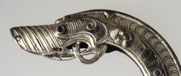 Over ten heavy silver chains, some over 0.5m long, have been found from this period; the double-linked Whitecleuch Chain is one of only two that have a penannular linking piece for the ends, with symbol decoration including enamel, which shows how these were probably used as "choker" necklaces.[90]