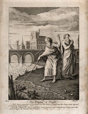 قال الرب لموسى ادخل إلى فرعون وقل له هكذا يقول الرب اطلق شعبي ليعبدوني، وإن كنت تأبى أن تطلقهم فها أنا أضرب جميع تخومك بالضفادع، فيفيض النهر ضفادع فتصعد وتدخل إلى بيتك وإلى مخدع فراشك وعلى سريرك وإلى بيوت عبيدك وعلى شعبك وإلى تنانيرك وإلى معاجنك، عليك وعلى شعبك وعبيدك تصعد الضفادع، فقال الرب لموسى قل لهرون مد يدك بعصاك على الأنهار والسواقي والآجام واصعد الضفادع على أرض مصر، فمد هرون يده على مياه مصر فصعدت الضفادع وغطت أرض مصر، وفعل كذلك العرافون بسحرهم واصعدوا الضفادع على أرض مصر، فدعا فرعون موسى وهرون وقال صليا إلى الرب ليرفع الضفادع عني وعن شعبي فاطلق الشعب ليذبحوا للرب، فقال موسى لفرعون عين لي متى أصلي لأجلك ولأجل عبيدك وشعبك لقطع الضفادع عنك وعن بيوتك ولكنها تبقى في النهر، فقال غدا فقال كقولك لكي تعرف أن ليس مثل الرب الهنا، فترتفع الضفادع عنك وعن بيوتك وعبيدك وشعبك ولكنها تبقى في النهر، ثم خرج موسى وهرون من لدن فرعون وصرخ موسى إلى الرب من أجل الضفادع التي جعلها على فرعون، ففعل الرب كقول موسى فماتت الضفادع من البيوت والدور والحقول، وجمعوها كوما كثيرة حتى أنتنت الأرض.