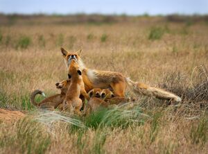 Grasslands support the greatest aggregations of large animals on earth, including jaguars, African wild dogs, pronghorn, black-footed ferret, plains bison, mountain plover, African elephant, Sunda tiger, black rhino, white rhino, savanna elephant, greater one-horned rhino, Indian elephant and swift fox. Grazing animals, herd animals, and predators in grasslands, like lions and cheetahs live in the grasslands of the African savanna.[17] Mites, insect larvaenematodes, and earthworms inhabit deep soil, which can reach 6 متر (20 أقدام) underground in undisturbed grasslands on the richest soils of the world. These invertebrates, along with symbiotic fungi, extend the root systems, break apart hard soil, enrich it with urea and other natural fertilizers, trap minerals and water and promote growth. Some types of fungi make the plants more resistant to insect and microbial attacks.[18]