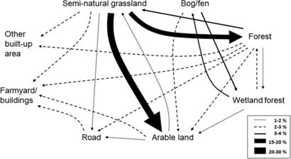 Land cover has always changed during the years. The following relates to the changes between 1960 and 2015. There has been a decrease in semi-natural grasslands and an increase in areas with arable land, forest and land used for infrastructure and buildings. The line style and relative thickness of the lines indicates the percentage of the total area that changed. Changes less than 1% and land-cover classes with all changes less than 1% (i.e. semi-natural wetlands and water) are not included.[13]