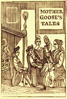 Édition anglaise d'Histoires ou contes du temps passé avec le frontispice et sa pancarte traduite : Mother Goose's tales (les contes de ma mère Loye), en 1763.