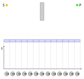 Feynman replaces complex numbers with spinning arrows, which start at emission and end at detection of a particle. The sum of all resulting arrows gives a final arrow whose length squared equals the probability of the event. In this diagram, light emitted by the source S can reach the detector at P by bouncing off the mirror (in blue) at various points. Each one of the paths has an arrow associated with it (whose direction changes uniformly with the time taken for the light to traverse the path). To correctly calculate the total probability for light to reach P starting at S, one needs to sum the arrows for all such paths. The graph below depicts the total time spent to traverse each of the paths above.