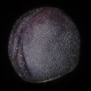 The rapeseed pods are green and elongated siliquae during development that eventually ripen to brown. They grow on pedicels 1 إلى 3 cm (3⁄8 إلى 1+3⁄16 in) long, and can range from 5 إلى 10 cm (2 إلى 4 in) in length.[7] Each pod has two compartments separated by an inner central wall within which a row of seeds develops.[9] The seeds are round and have a diameter of 1.5 إلى 3 mm (1⁄16 إلى 1⁄8 in). They have a reticulate surface texture,[7] and are black and hard at maturity.[9]