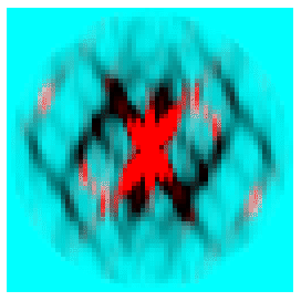 Whether the array of atoms is finite or infinite, one can also imagine an "intensity reciprocal lattice" I[g], which relates to the amplitude lattice F via the usual relation I = F*F where F* is the complex conjugate of F. Since Fourier transformation is reversible, of course, this act of conversion to intensity tosses out "all except 2nd moment" (i.e. the phase) information. For the case of an arbitrary collection of atoms, the intensity reciprocal lattice is therefore: