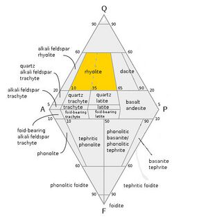 An extrusive igneous rock is classified as rhyolite when quartz constitutes 20% to 60% by volume of its total content of quartz, alkali feldspar, and plagioclase (QAPF) and alkali feldspar makes up 35% to 90% of its total feldspar content. Feldspathoids are not present. This makes rhyolite the extrusive equivalent of granite. However, while the IUGS recommends classifying volcanic rocks on the basis of their mineral composition whenever possible, volcanic rocks are often glassy or so fine-grained that mineral identification is impractical. The rock must then be classified chemically based on its content of silica and alkali metal oxides (K2O plus Na2O). Rhyolite is high in silica and total alkali metal oxides, placing it in the R field of the TAS diagram.[6][7][8][9]