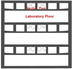 Inside the laboratories, the ducts and vents are reinforced by concrete Vierendeel trusses supported by post-tensioned columns.[24] The authorities at the time were very cautious due to the fact that they felt these trusses would not be able to hold in case of an earthquake, but in a tour de force of structural design, Komendant was able to achieve twice the ductility that a steel frame offered.[24]
