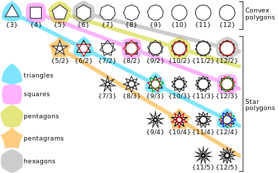 Regular convex and star polygons with 3 to 12 vertices labelled with their Schläfli symbols