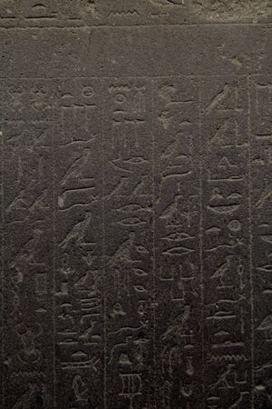 The Shabaka Stone, sometimes Shabaqo, is a relic incised with an ancient Egyptian religious text, which dates from the Twenty-fifth Dynasty of Egypt.[1] In later years, the stone was likely used as a millstone, which damaged the hieroglyphs. This damage is accompanied by other intentional defacements, leaving the hieroglyphic inscription in poor condition.
